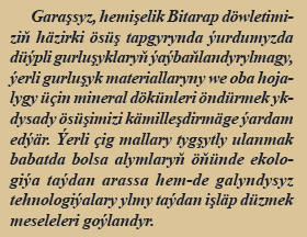 Berkarar döwletiň täze eýýamynyň Galkynyşy döwründe hormatly Prezidentimiziň parasatly baştutanlygynda himiýa senagatyny ösdürmek boýunça alnyp barylýan işler ýurdumyzyň mineral serişdeleriniň gaýtadan işlenýän möçberini mundan beýläk hem artdyrmaga, öňdebaryjy tehnologiýalary önümçilige ornaşdyrmaga, çykarylýan önümleriň görnüşini giňeltmek üçin önümçilikleriň tehniki mümkinçiligini ýokarlandyrmaga gönükdirilýär [1; 2].